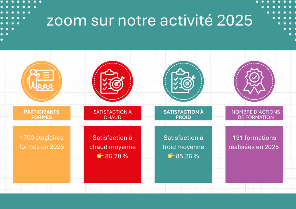 - Au niveau associatif : notre Conseil d’administration participe à l’évaluation des formations, à la définition des priorités pédagogiques et à l’adéquation de nos actions avec les attentes des bénéficiaires et des organismes.